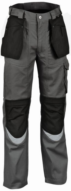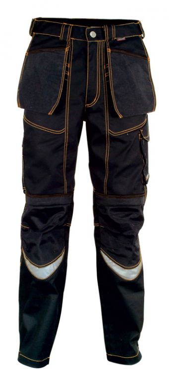 4 ampie tasche anteriori, doppia tasca posteriore di cui una con pattina, inserti rifrangenti 3M™ Scotchlite™ Reflective Material - 8910 Silver Fabric, passante portamartello, rinforzi ginocchia in CORDURA®, taglio ergonomico di gambe e ginocchia, tasca laterale, tasca portametro, tasche esterne porta chiodi in CORDURA®, tasche per ginocchiere in CORDURA® con posizione regolabile, vita regolabile, zip YKK®.