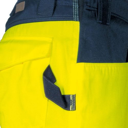 DESCRIZIONE: ampie tasche anteriori, cavallo rinforzato , doppia tasca posteriore di cui una con pattina, chiuse con velcro, elastico in vita, passante portamartello, tasca portametro
