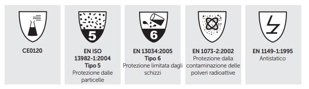 CE0120EN ISO 13982-1:2004 TIPO 5EN ISO 13034:2005 TIPO 6EN 1073-2: 2002EN 1149-1:1995