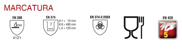 NORMATIVE: EN 420, EN 388, EN 374, Contatto con gli alimenti
