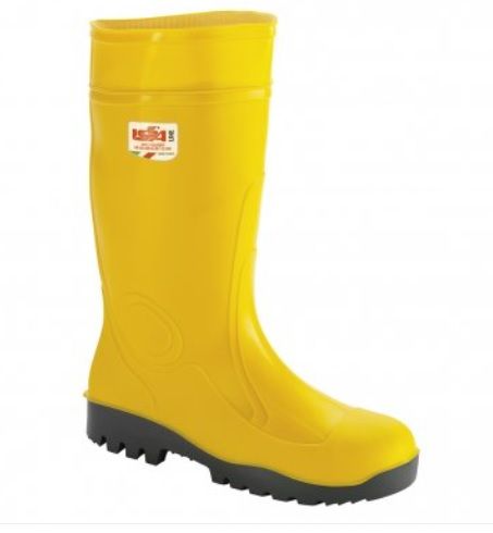 Stivale antinfortunistico da lavoro in PVC con puntale e lamina in acciaio, suola carrarmato, taglio ergonomico e tre tipi di rifinitura per facilitare la pulitura.