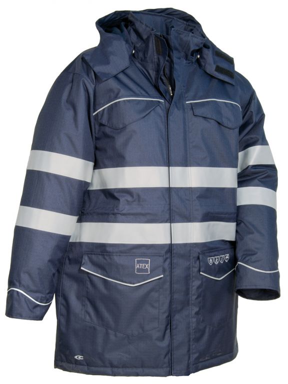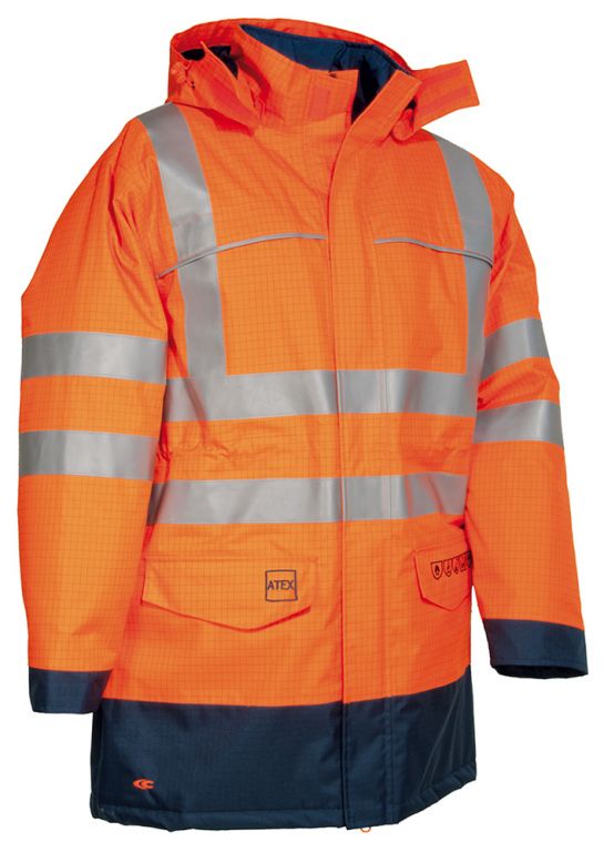 DESCRIZIONE CAPO ESTERNO: 2 tasche con pattina e velcro, 2 tasche petto con velcro, apertura rapida con zip, bande reflex fiammaritardante 3M™ SCOTCHLITE™ Reflective Material - 8935 Silver Fabric, cappuccio regolabile e staccabile, consigliato in ambiente ATEX, cuciture nastrate e termosaldate, pittogrammi delle norme ricamati sulla tasca anteriore, polsini regolabili con velcro, ricamo “ATEX” sulla tasca anteriore, tasca napoleone, vita regolabile tramite coulisse, zip interna fondo