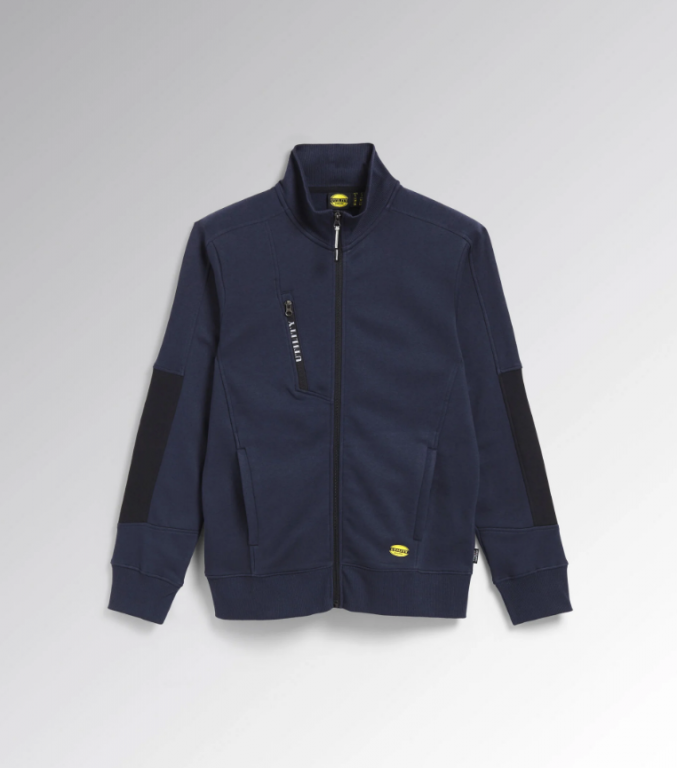 Felpa full zip garzata con inserti laterali neri su maniche e fianchi. Due tasche aperte laterali e una tasca frontale con zip. Collo, polsini e fondo in costina elasticizzata.