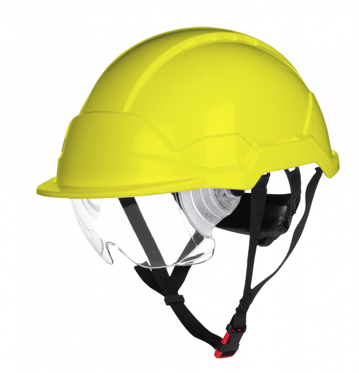 Elmetto di sicurezza PHOENIX PRO. Calotta in ABS, bardatura in polietilene 6 punti con 6 fasce in tessuto, regolazione a cremagliera da 52 a 63cm, visiera corta, occhiali di sicurezza integrati con trattamento antigraffio K e antiappanamento N, aerazioni laterali, montone in tessuto 3D, sottogola 4 punti in dotazione con il casco.