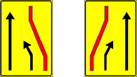 Indica la riduzione da due a una corsia di marcia per la presenza di una deviazione in corrispondenza di un cantiere stradale.