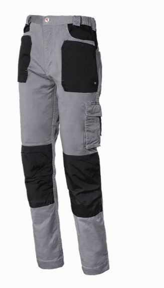 Pantalone con elastico in vita, tascone laterale e tascone porta metro, porta ginocchiere in tessuto rinforzato e impermeabile.