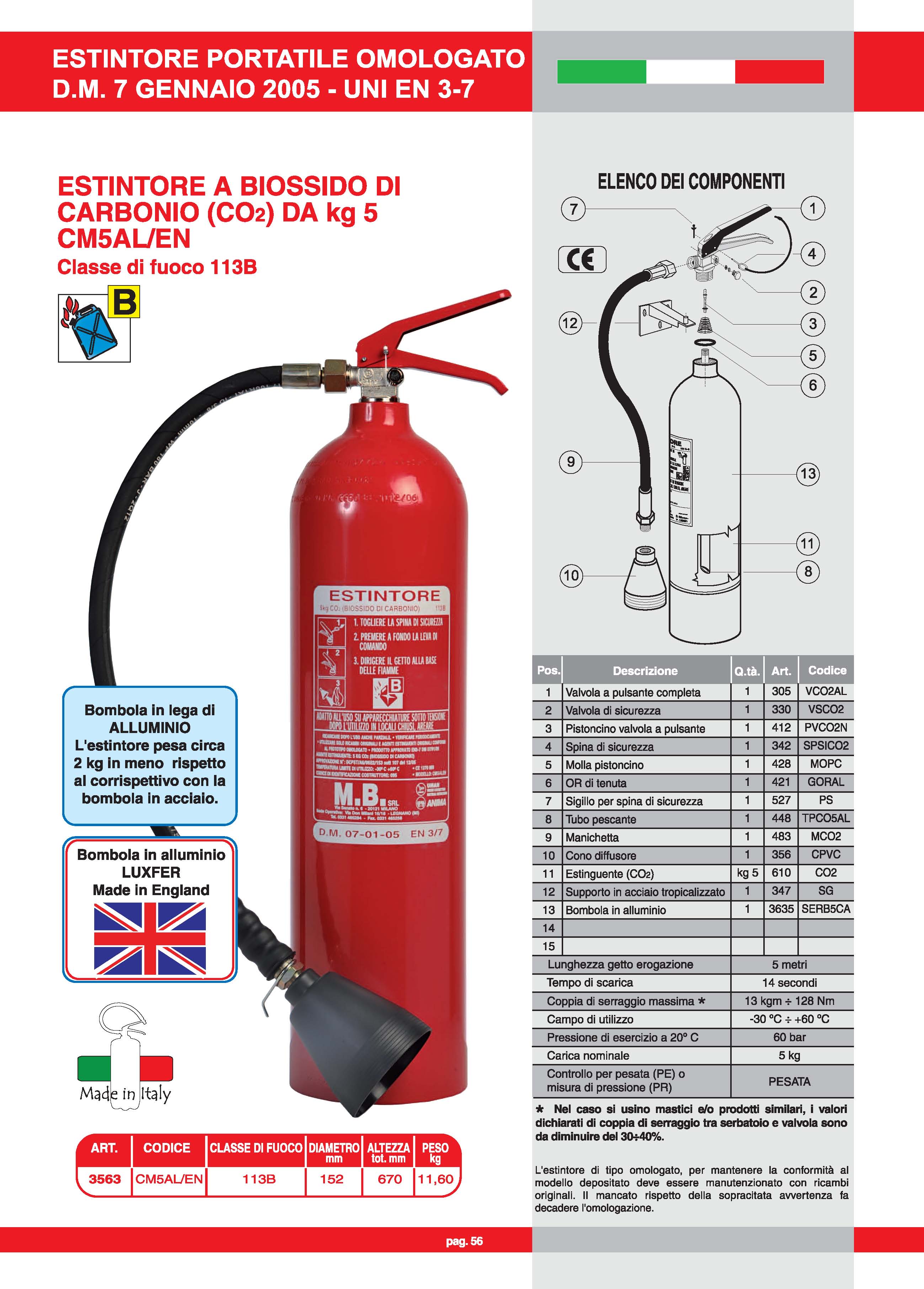 Estintore a biossido di carbonio da kg 5 con bombola in alluminio