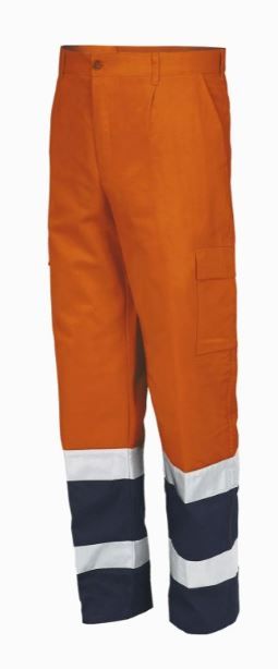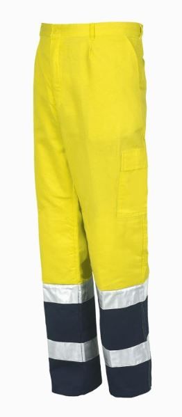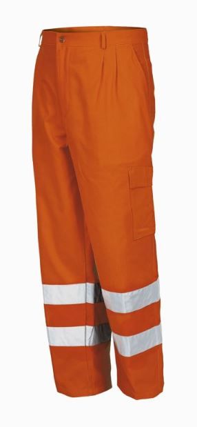 Tasche anteriori a filetto con apertura obliqua, tascone laterale con pattina con velcro e porta badge , tasca posteriore con bottone, tasca portametro. Elastico in vita sulla parte posteriore. Bande retroriflettenti sul fondo pantalone. Patta con cerniera.