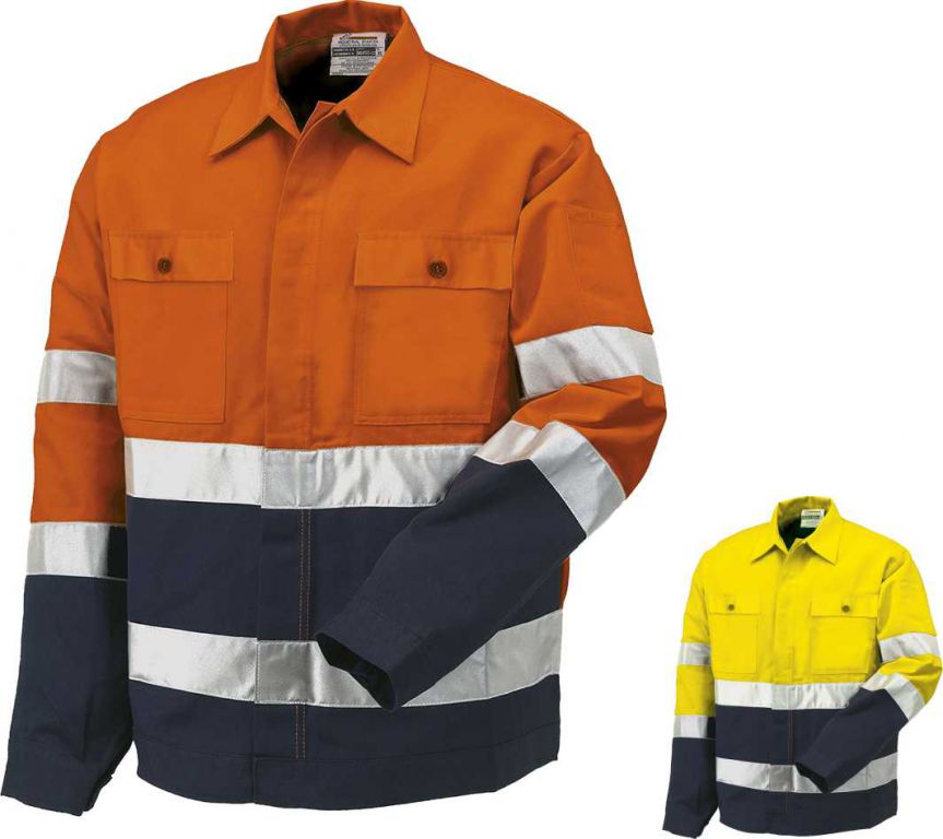 Due taschini applicati chiusi con pattina e bottone. Chiusura con bottoni ricoperti da lista e polsini con bottone, regolazione in vita con bottoni. Collo a camicia. Bande rifrangenti sul torace e sulle braccia.