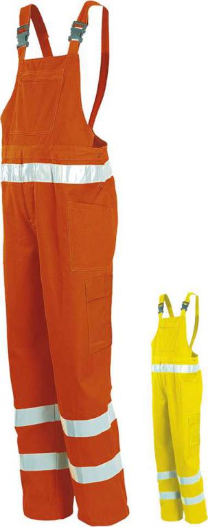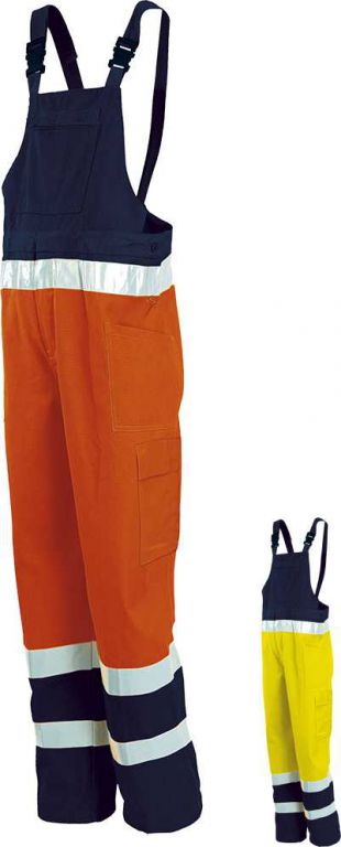 Tasche applicate sul davanti, tasca posteriore applicata e chiusa con bottone e tasca porta metro, tasca sulla pettorina chiusa con cerniera. Due aperture laterali con bottone per facilitare la vestizione, elastico in vita, tasca laterale con chiusura con velcro e porta badge. Bretelle regolabili con fibbie in plastica. Bande rifrangenti in vita e sul fondo. Chiusura davanti con bottoni ricoperti da patta.