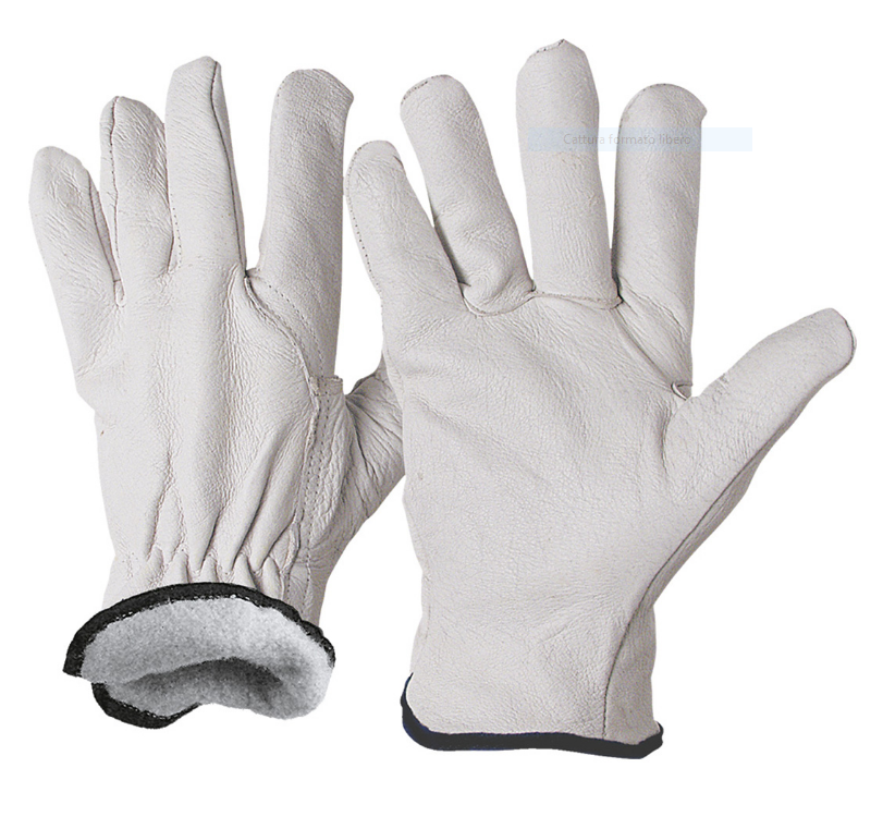 Guanto con palmo e dorso in pieno fiore orlato al fondo con elastico sul dorso, imbottito in pelliccia sintetica.