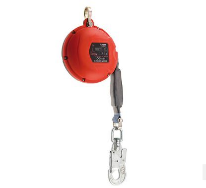 Dispositivo anticaduta retrattile, lunghezza fettuccia 6 m. Fettuccia in poliammide da 20 mm, carico di rottura 12 kN. Dotato di assorbitore di energia e connettore girevole. Carter di protezione in ABS.