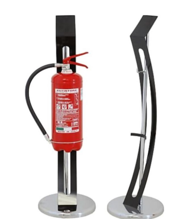 Piantana cromata porta estintori, con asta e cartello. Modello particolarmente curato nelle finiture dal design moderno, ideale in ambienti quali uffici, studi, hall di hotel e sale mostra.