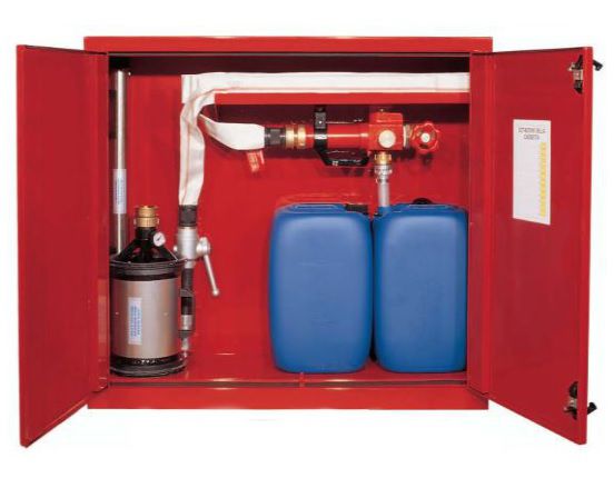 Materiale: Struttura in lamiera di acciaio con portello completo di chiusura a chiave. Verniciatura di colore rosso RAL 3000 spessore minimo 80 micron. La scarica della schiuma viene controllata a mezzo di una lancia in lega leggera a bassa o media espansione con impugnatura anatomica di facile e rapida intercettazione; la lancia è alimentata da una manichetta UNI 45, di lunghezza 20 metri avvolta in modo tale da consentirne un facile e rapido svolgimento. La lancia idrica a leva a tre effetti consente l’erogazione della sola acqua quando non sia necessario anche l’impiego dello schiumogeno. Questo tipo di apparecchiatura, per la sua validità polifunzionale trova impiego in un molteplice numero di applicazioni in funzione anche dell’estrema facilità e rapidità di intervento.