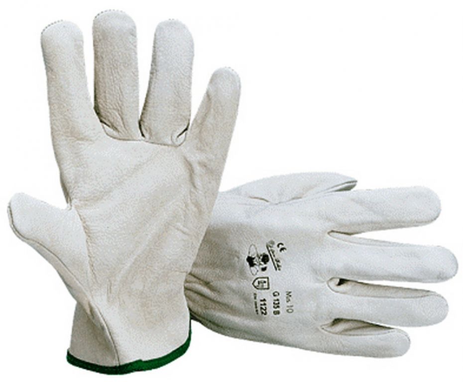 Guanto in pelle bovina sia sul palmo, e sia sul dorso, di colore bianco, orlato al fondo e con elastico.